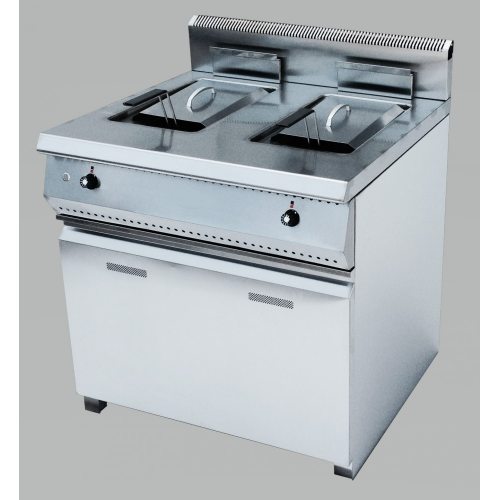 Газовая фритюрница KAYMAN 800 линии на закрытом стенде с дверцами, 2 фритюрные ванны max 15+15 литров/рабочий 9+9 л 2 корзина, 2 специальные горелки, с электророзжигом, полный Газконтроль +, 2 газовых термостата плавно регулирующих температуру масла от +40-190С