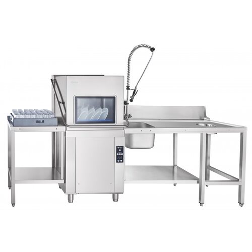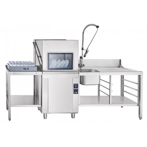 - производительность 1100 тарелок в час;. - раздельные системы циркуляции воды для мытья и ополаскивания;. - мощные нержавеющие нагревательные элементы обеспечивают возможность эксплуатации машин как при горячем, так и при холодном водоснабжении;. - цельнотянутая ванна;. - скругленные углы ванны для облегчения обслуживания и гигиенической очистки;. - металлические детали машин, контактирующие с водой, а также облицовка - из нержавеющей стали AISI 304;. - основные детали разбрызгивателей - из кислотостойкой нержавеющей стали AISI 321;. - разборная конструкция разбрызгивателей обеспечивает их быструю и легкую очистку;. - автоматическое наполнение ванны водой и поддержание ее уровня;. - постоянный контроль температуры воды в ванне и бойлере;. - двойная система фильтров в моечной ванне;. - три режима мойки;. - кнопочная электронная панель отображает выбранную программу мойки, температуру в ванне и бойлере;. - обзорное стекло на куполе;. - лампа освещения внутри моечной камеры;. - насос для ополаскивания (повышающий насос) для стабильного ополаскивания при нестабильном давлении напора воды;. - эксплуатируется с предмоечными (входными) столами СПМП-6-1, СПМП-6-3, СПМП-6-5, СПМП-6-7 и раздаточными (выходными) столами СПМР-6-1 и СПМР-6-5. Возможна установка раздаточных столов спереди посудомоечной машины (при стыковке к правому борту машины предмоечных столов):. Стандартная комплектация купольной посудомоечной машины МПК-1100К:. - дозатор моющего средства;. - дозатор ополаскивающего средства;. - насос мойки;. - насос ополаскивания;. - касета для мытья тарелок;. - нейтральная кассета для мытья стаканов и чашек;. - металлическая сетка для нейтральной кассеты (рамка в сборе);. - стакан для мытья столовых приборов. Высота проема моечных камер посудомоечных машин и размеры посуды, другого кухонного инвентаря, возможные для мойки