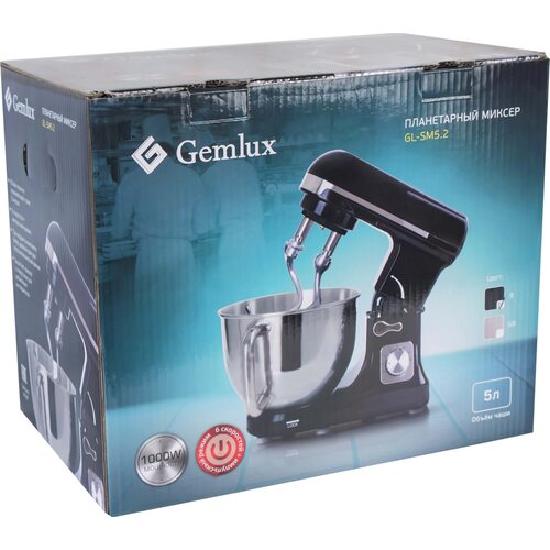 Планетарный миксер GEMLUX GL-SM5.2B предназначен для замешивания жидкого теста и приготовления кремов, муссов, соусов и пюре в домашних условиях или на предприятиях общественного питания и торговли. Оснащён откидной рабочей головкой и съёмной дежой с защитной крышкой. Широкий желоб на крышке предназначен для добавления ингредиентов в процессе работы.Корпус изготовлен из прочного и надёжного ABS-пластика чёрного цвета, крышка &ndash из MS-пластика, дежа &ndash из нержавеющей стали.Максимальная загрузка: