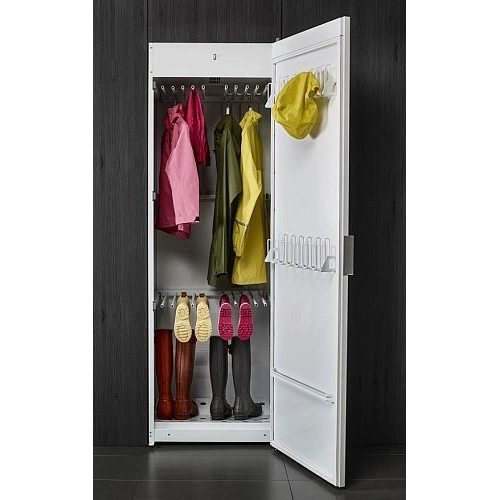 Максимальный объем загрузки составляет 4 кг вещей за один раз. Вентилируемая сушка обеспечивает максимально бережное и аккуратное высушивание даже самых деликатных вещей, а многочисленные режимы помогут задать оптимальные настройки для каждого конкретного случая.Внутри шкафа расположено несколько уровней складных телескопических вешалок, на которых можно как развешивать плечики, так и размещать обувь. Их общая длина составляет 16 м. На дверце находятся специальные держатели для шапок, перчаток и прочих мелких предметов. При необходимости дверцу можно перевесить, расположив сушильный шкаф в удобном для вас месте. Обратите внимание, что он требует обязательного подключения к вентиляционной системе.Панель управления вынесена на дверцу и оборудована дисплеем с кнопочными переключателями. С его помощью можно изменять температуру и продолжительность сушки при работе в ручном режиме, выбирать автоматические программы, задавать отсрочку начала их выполнения при необходимости. Также на нем отображается индикация окончания программы и обратный отсчет времени до постановки программы на паузу в том случае, если дверь закрыта не полностью.