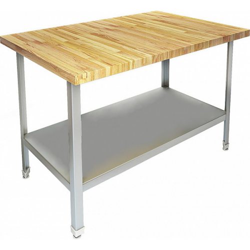Разборный каркас выполнениз уголка крашенного металла, сплошная полка-накладка из стали AISI 430, столешница - из бука толщиной 40 мм.